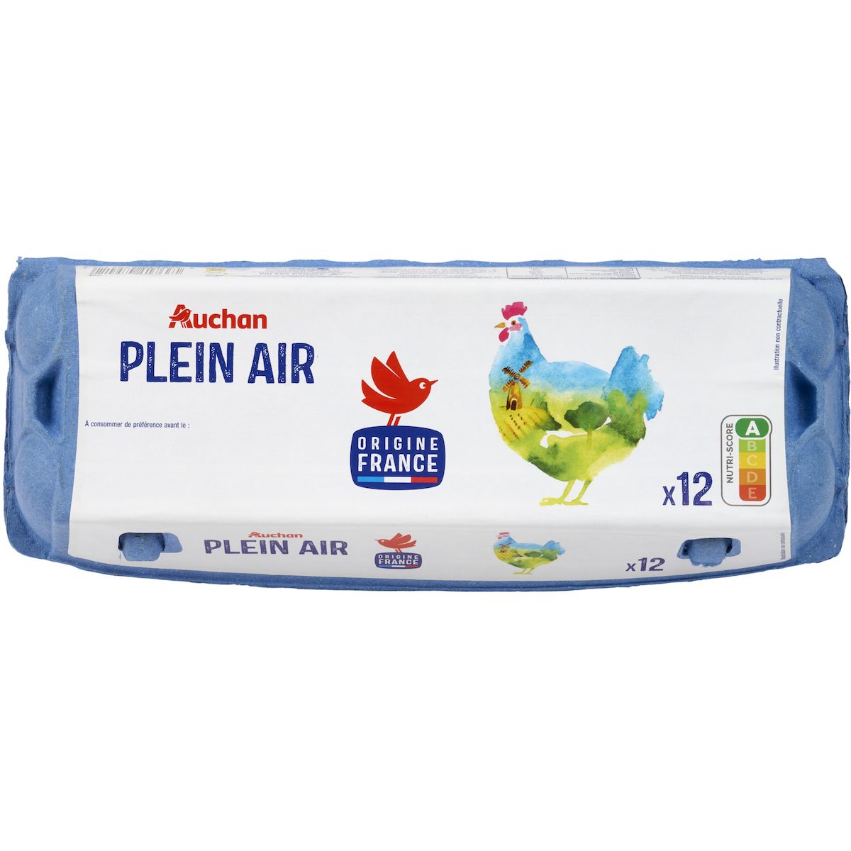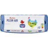 Ingrédients : 12 OEUFS de catégorie A de poules élevées en Plein Air (code commençant par 0 ou 1 sur l'oeuf). Calibre Moyen ou Gros (mention indiquée sur le dessus de l'emballage).