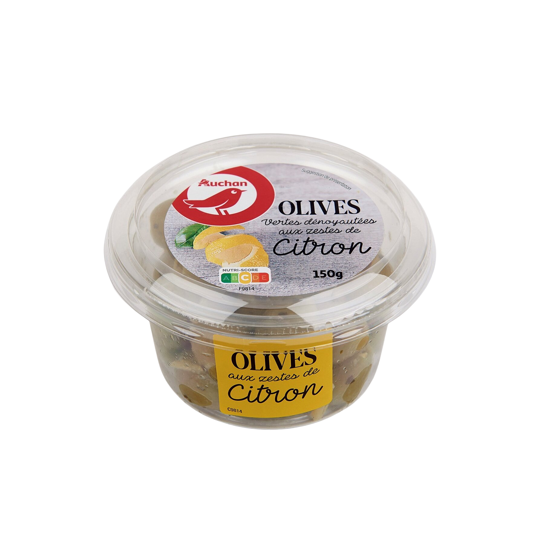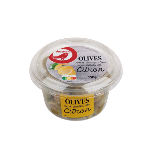Ingrédients : Olives vertes dénoyautées 93,5% (olives 91,2%, sel), zestes de citron 2,8%, huile de colza, jus de citron, basilic 0,3%. Pourcentages exprimés sur le total de la recette. Traces éventuelles de lait, blé, graines de sésame, fruits à coque, lupin et sulfites.