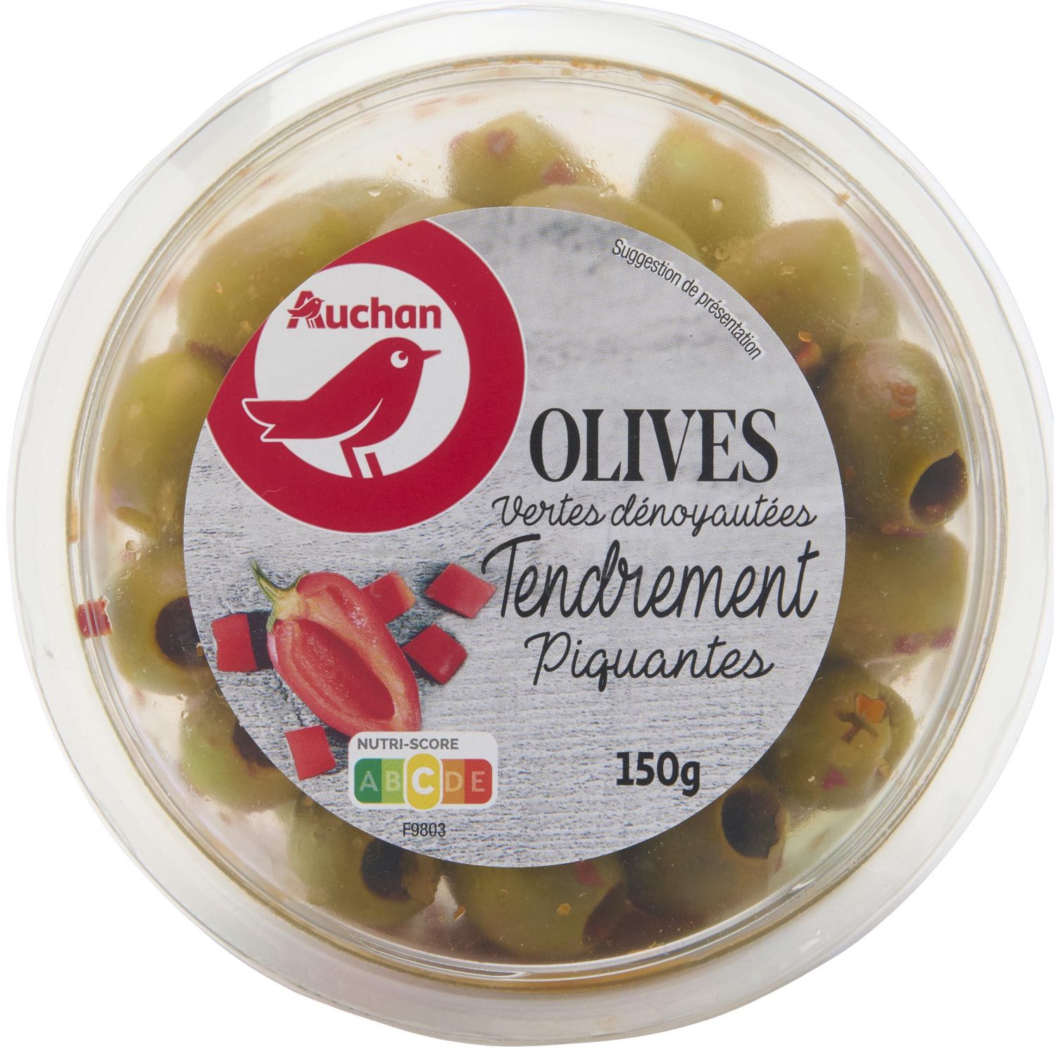 Ingrédients : Olives vertes dénoyautées 89% (olives 87%, sel), sauce piquante 7,4% (piments, sel, acidifiant : acide acétique), poivrons rouges 3,1% (poivrons rouges 2,3%, vinaigre d’alcool, sucre, sel, affermissant : chlorure de calcium). Pourcentages exprimés sur le total de la recette. Traces éventuelles de blé, orge, lait et lupin.