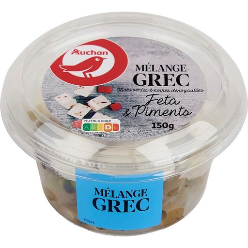 Ingrédients : Olives vertes dénoyautées 42% (olives 41,0%, sel), feta 25,2% (LAIT origine Grèce), olives noires Kalamon dénoyautées 14% (olives 13,3%, sel, vinaigre de vin), piments 12% (piments 10,9%, sel, vinaigre d'alcool, acidifiant : acide citrique, colorant : riboflavine), poivrons rouges 3,9% (poivrons rouges 2,9%, vinaigre d'alcool, sucre, sel), huile de colza, herbes de Provence 0,2%. Pourcentages exprimés sur le total de la recette. Traces éventuelles de blé, graines de sésame, fruits à coque, lupin et sulfites.