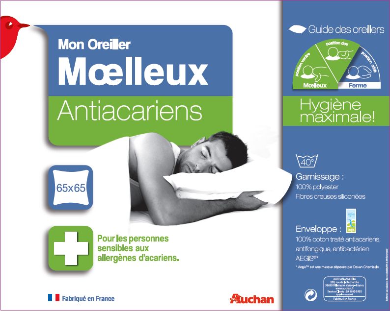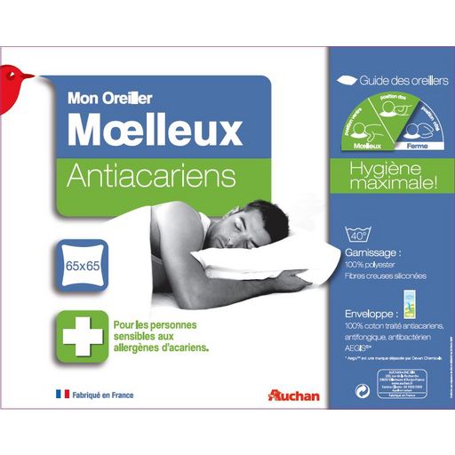 Oreiller synthétique au confort moelleux. Carré ou rectangulaire, il est parfait pour les personnes qui dorment sur le ventre ou sur le dos. Son enveloppe en pur coton est traitée Aegis anti-acariens, antibactéries et antifongique, vous assurant ainsi une hygiène parfaite et un grand confort de sommeil. Et côté pratique, cet oreiller se lave et sèche en machine. Excellente qualité, fabrication française.