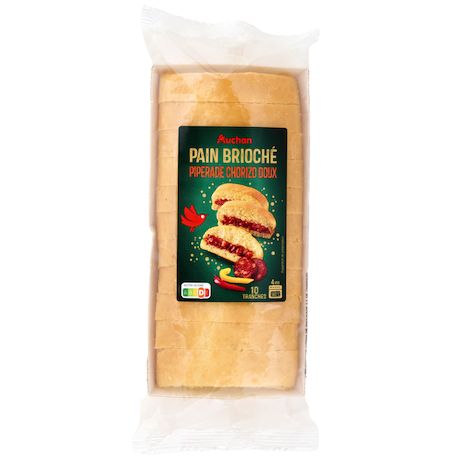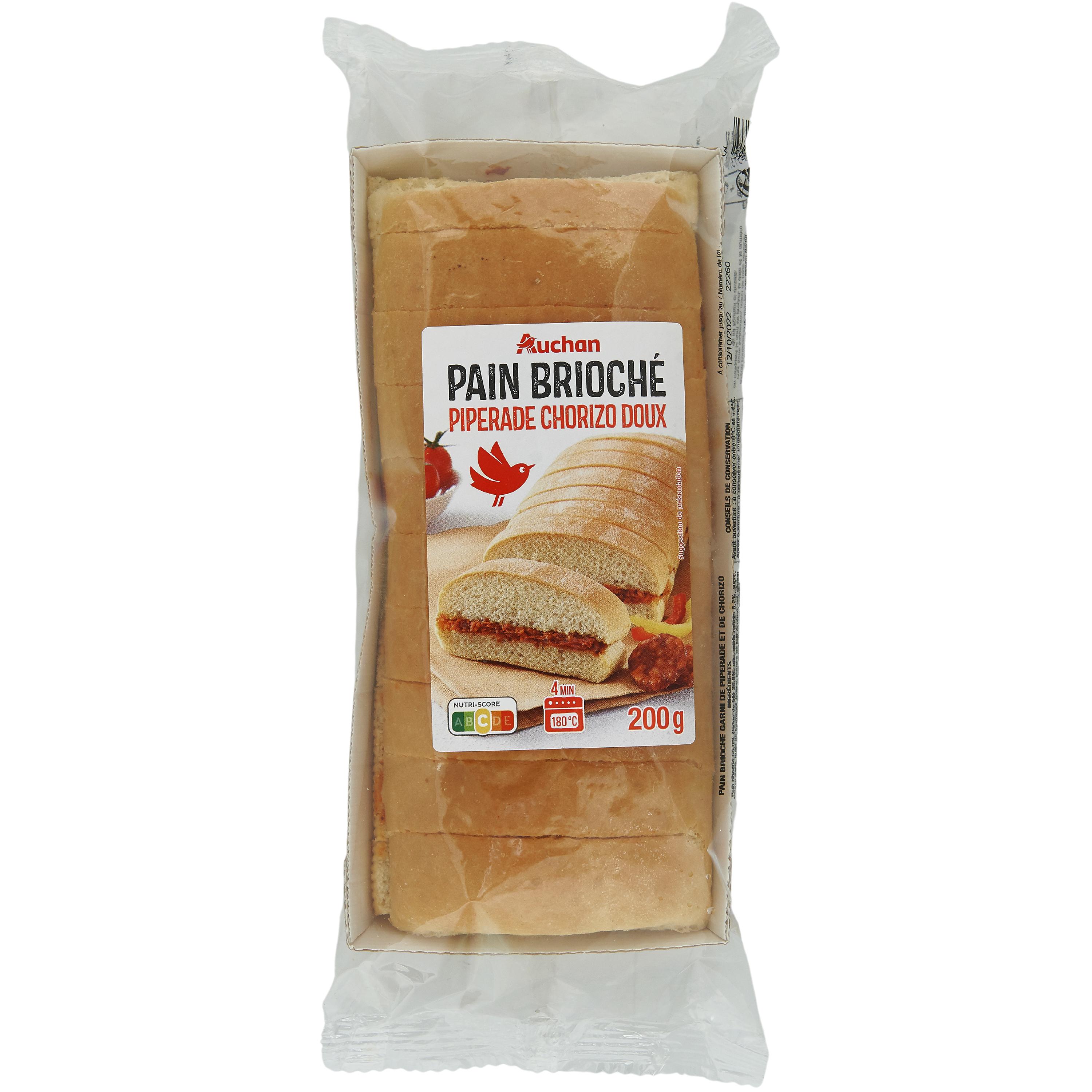 Ingrédients : Pain brioché 65,0% (farine de blé 35,8%, eau, oeufs entiers 8,2%, sucre, beurre (lait), huile de tournesol, levure, poudre de lait écrémé, sel, gluten de blé, farine de blé malté, fibre de blé, extrait d’acérola), tomates entières pelées 16,0% (tomates pelées, jus de tomate, sel), allumettes de chorizo 9,5% (viande et gras de porc, sel, dextrose, piment paprika, épices et extraits d’épices, anti-oxygène : ascorbate de sodium conservateur : nitrite de sodium, ferments), poivrons 6,5%, échalotes, fécule de pomme de terre, basilic, ail, huile d'olive vierge extra, sel, poivre, origan, herbes de Provence. Elaboré à partir de lait origine France et de porc origine UE.Pourcentages exprimés sur le total de la recette.Traces éventuelles de poisson, soja, graines de sésame, moutarde et céleri.