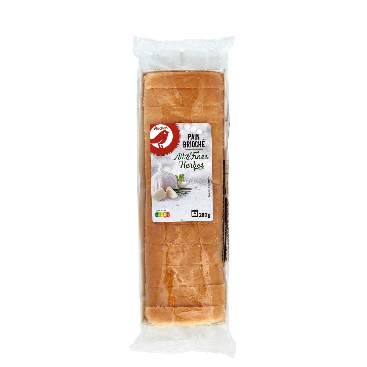 Ingrédients : Pain brioché 64.3% (farine de BLÉ, eau, ŒUFS entiers, sucre, beurre (LAIT), huile de tournesol, levure, poudre de lait écrémé, sel, gluten de BLÉ, farine de blé malté, fibre de BLÉ, extrait d'acérola), fromage frais au lait de vache (LAIT) 14,8%, ail (origine Chine, France) 9,2%, crème fraîche épaisse (LAIT) (crème fraîche, FERMENTS LACTIQUES), persil 1,4%, ciboulette 0,9%, poivre, sel. Pourcentages exprimés sur la totalité de la recette. Traces éventuelles de poisson, soja, graines de sésame, moutarde et céleri.