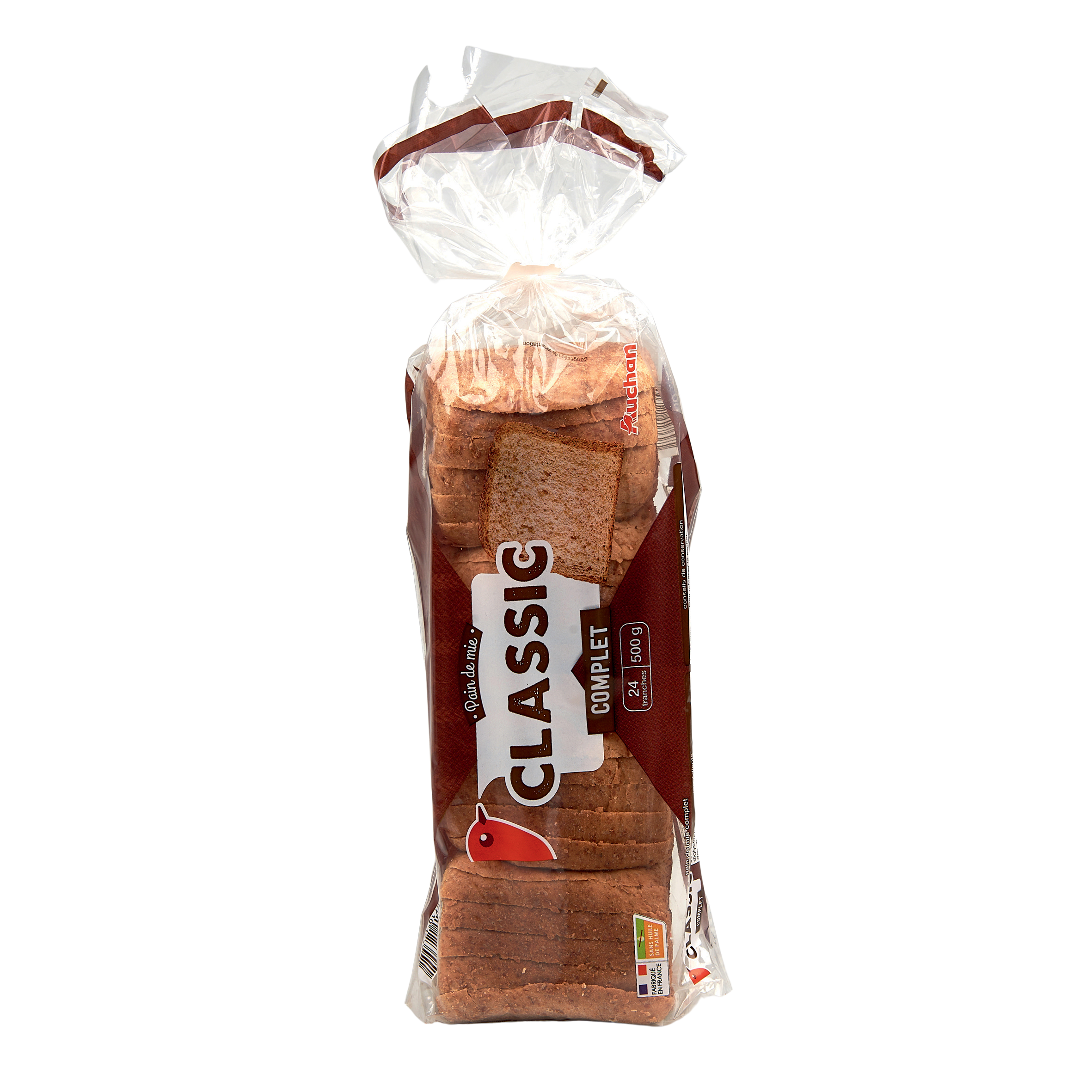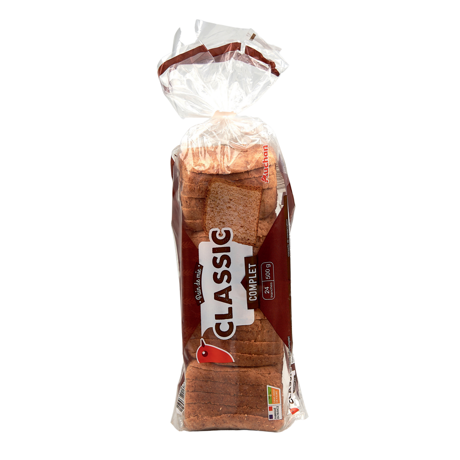 Ingrédients : Farine complète de blé 60%, eau, huile de colza, levure, sucre, gluten de blé , sel, arôme naturel (contient alcool), farine de blé 0,6%, émulsifiant : mono- et diglycérides d'acides gras, conservateur : propionate de calcium, agent de traitement de la farine : acide ascorbique. Traces éventuelles de soja.