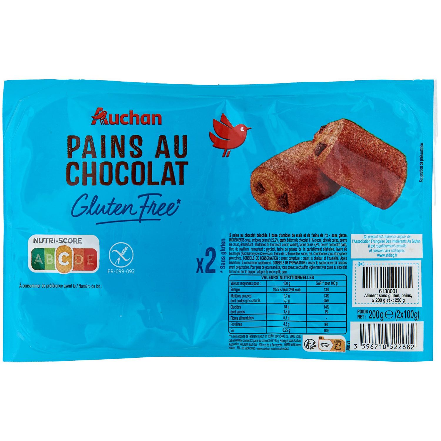 Ingrédients : Eau, amidons de maïs 22.9%, OEUFS, bâtons de chocolat 11% (sucre, pâte de cacao, beurre de cacao, émulsifiant : lécithines de tournesol, arôme vanille), farine de riz 5.8%, beurre concentré (LAIT), fibre de psyllium, humectant : glycérol, farine de graines de lin partiellement déshuilée, levure de boulanger : Saccharomyces Cerevisiae , farine de riz fermentée, sucre, sel.