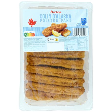 Ingrédients : Colin d'Alaska (POISSON) 66%, chapelure 16% (farine de BLÉ, levure, sel, épices : curcuma, paprika), huiles végétales (colza et tournesol en proportion variable), eau, farine de BLÉ, amidon modifié de pomme de terre, épaississant : méthylcellulose, sel. Traces éventuelles de lait, œuf, soja, céleri, mollusques et autres céréales contenant du gluten. * Malgré tout le soin apporté à la préparation de nos produits, la présence exceptionnelle d'arêtes n'est jamais exclue. ** Ce produit provient d'une pêcherie qui a répondu au référentiel environnemental du MSC pour une pêche durable et bien gérée. www.msc.org/fr