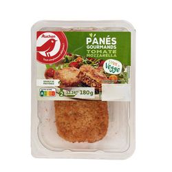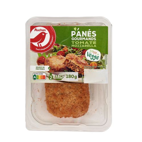 Ingrédients : Préparation à base de tomates et de mozzarella 70%: tomates cerises 17%, eau, protéines de BLÉ texturées déshydratées (protéines de BLÉ, farine de BLÉ), oignons, mozzarella 4% (mozzarella (LAIT origine France), anti-agglomérant : amidon de pomme de terre), tomates séchées marinées 3% [tomates séchées, huile végétale (colza, olive), vinaigre de Xérès, ail, origan, sel, acidifiant: acide citrique], emmental (LAIT origine France) , tomate double concentré 3%, blanc d'OEUF en poudre, fibres de BLÉ (fibres de BLÉ et de psyllium), basilic, amidon, huile d'olive vierge extra, vinaigre, plantes aromatiques, arôme naturel (dont CÉLERI), ail déshydraté, sel. Enrobage 30% : chapelure (farine de BLÉ, levure, sel), enrobant (eau, farine de BLÉ), huiles végétales (colza et tournesol en proportion variable). Pourcentages exprimés sur le total de la recette. Traces éventuelles de poissons, mollusques, soja