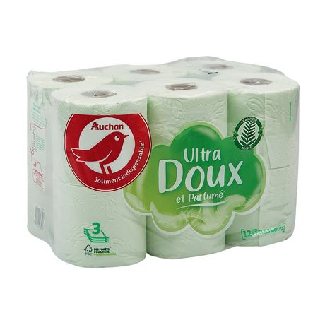 Papier toilette Ultra Doux et Parfumé, Auchan 100% ouate de pure cellulose., Le parfum de synthèse est appliqué sur le mandrin. Convient pour fosse septique et broyeur.