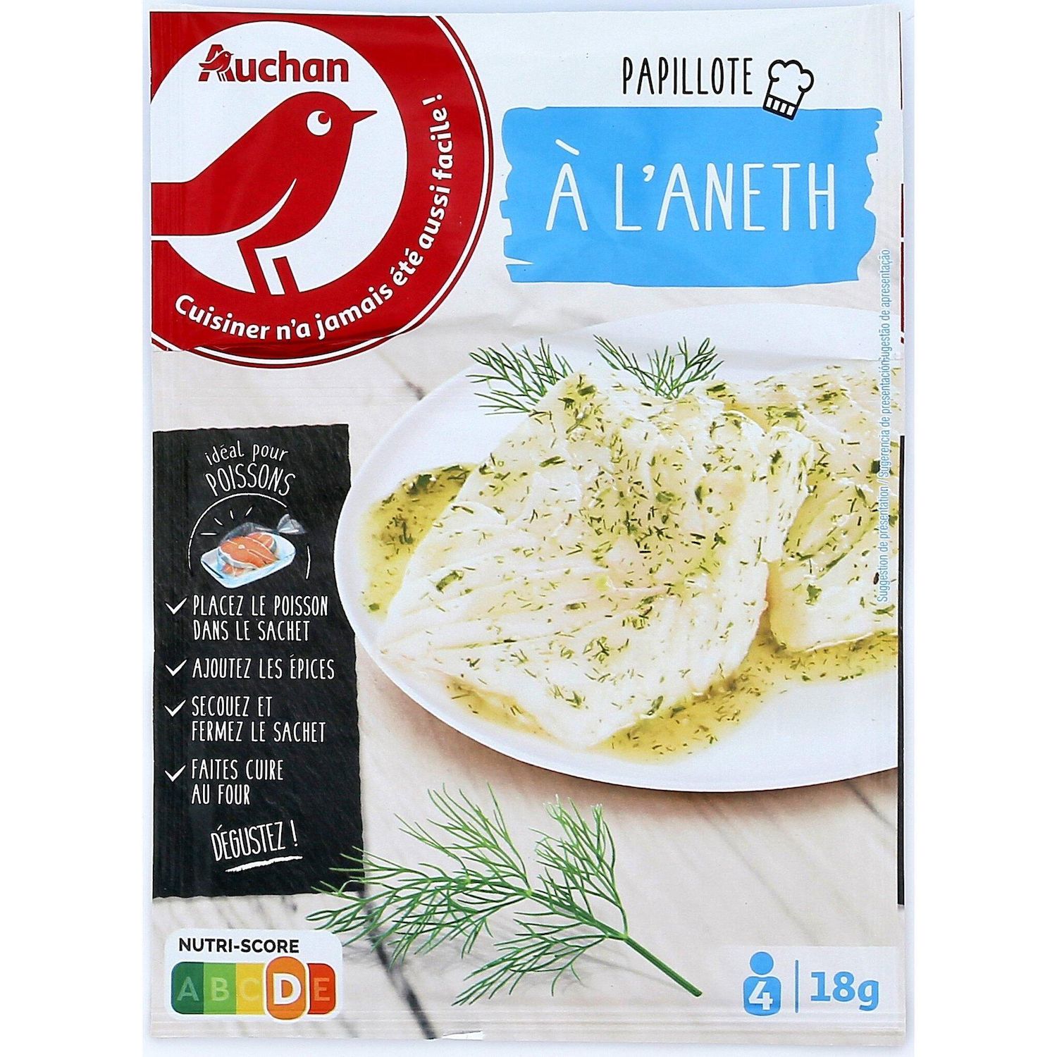 pour 4 filets de poisson:Déplier le sac de cuisson et mettre l’attache de côté. Déposer les 4 filets de poisson dans le sac de cuisson. Saupoudrer le mélange d’aromates (pas besoin de saler). Secouer doucement pour bien répartir le mélange d’aromates. Ajouter deux cuillères à soupe d’eau froide. Refermer le sac avec l'attache et le déposer dans un plat allant au four. Mettre à cuire au milieu d'un four préchauffé.Four électrique chaleur traditionnelle 180°c (th.180°C) : laisser cuire 20 min environ pour du poisson décongelé ou frais et 35 min environ pour du poisson surgelé.Ouvrir le sac en faisant attention à ne pas se brûler.Ne pas utiliser la fonction grill, ni la fonction chaleur tournante de votre four.Le sac ne doit pas toucher la résistance.Ne pas utiliser au four micro-ondes.