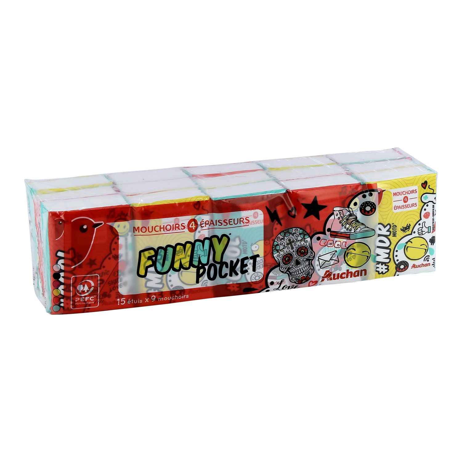 AUCHAN Mouchoirs 4 épaisseurs étuis HOME et FUNNY POCKET15*9 et 24*9