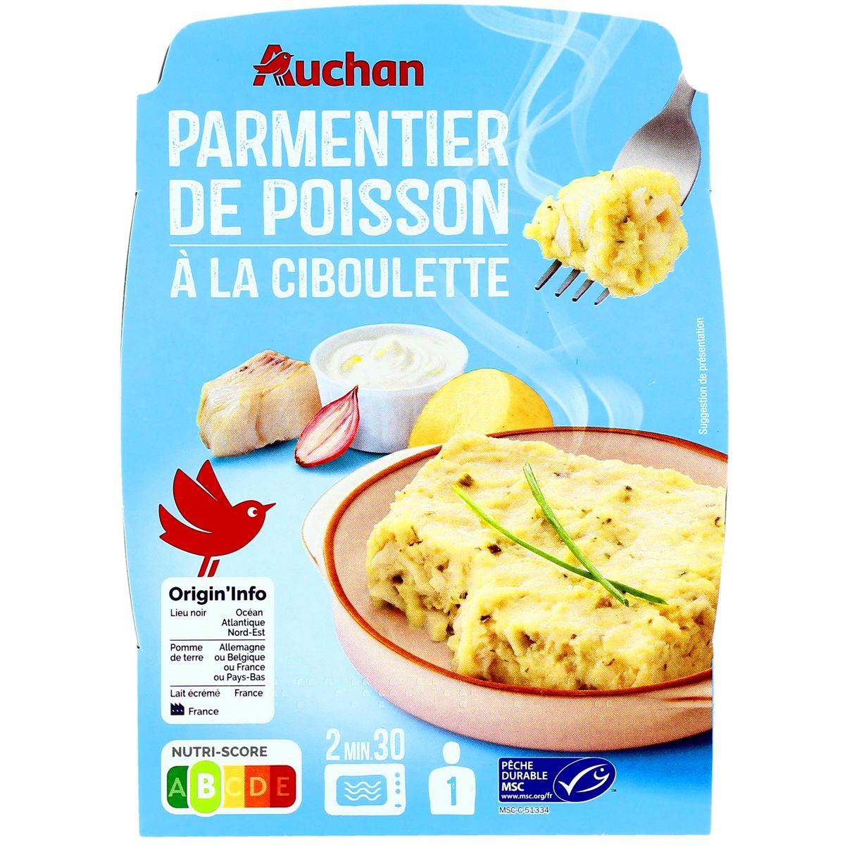 Ingrédients : LAIT écrémé réhydraté 35.5% (eau, LAIT écrémé en poudre - origine France), chair de lieu* noir - Pollachius virens 25.6% (POISSON), eau, crème fraîche 10% (LAIT - origine Allemagne ou France), flocons de pommes de terre 7.6% (pommes de terre déshydratées, curcuma, émulsifiant : mono et diglycérides d'acides gras), beurre (LAIT - origine UE) , huile de colza, échalotes 0.8%, sel, amidon de maïs, ail, ciboulette 0.2%, persil, poivre. *Lieu noir pêché en Océan Atlantique Nord-Est. Ce produit provient d'une pêcherie qui a répondu au référentiel environnemental du MSC pour une pêche durable et bien gérée. www.msc.org/fr