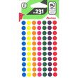 231 pastilles couleur diamètre 8mm, 3 feuilles de 77 pastilles. 7 couleurs assorties sur la feuille : bleu, jaune, orange, rose, vert, violet, rouge. Adhésif permanent