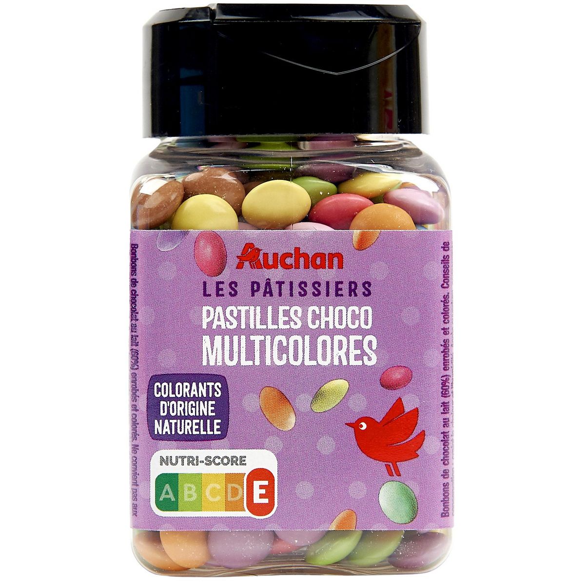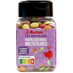 Ingrédients : Sucre, pâte de cacao, beurre de cacao, poudre de LAIT entier, amidon de riz, émulsifiant : lécithines de tournesol agents d'enrobage : gomme arabique, cire de carnauba, cire d'abeille blanche et jaune denrées alimentaires colorantes : concentrés de jus de raisin, de radis, de cassis, de citron, de betterave rouge, extrait de carthame, malt d'orge (contient GLUTEN), concentré d'algues.