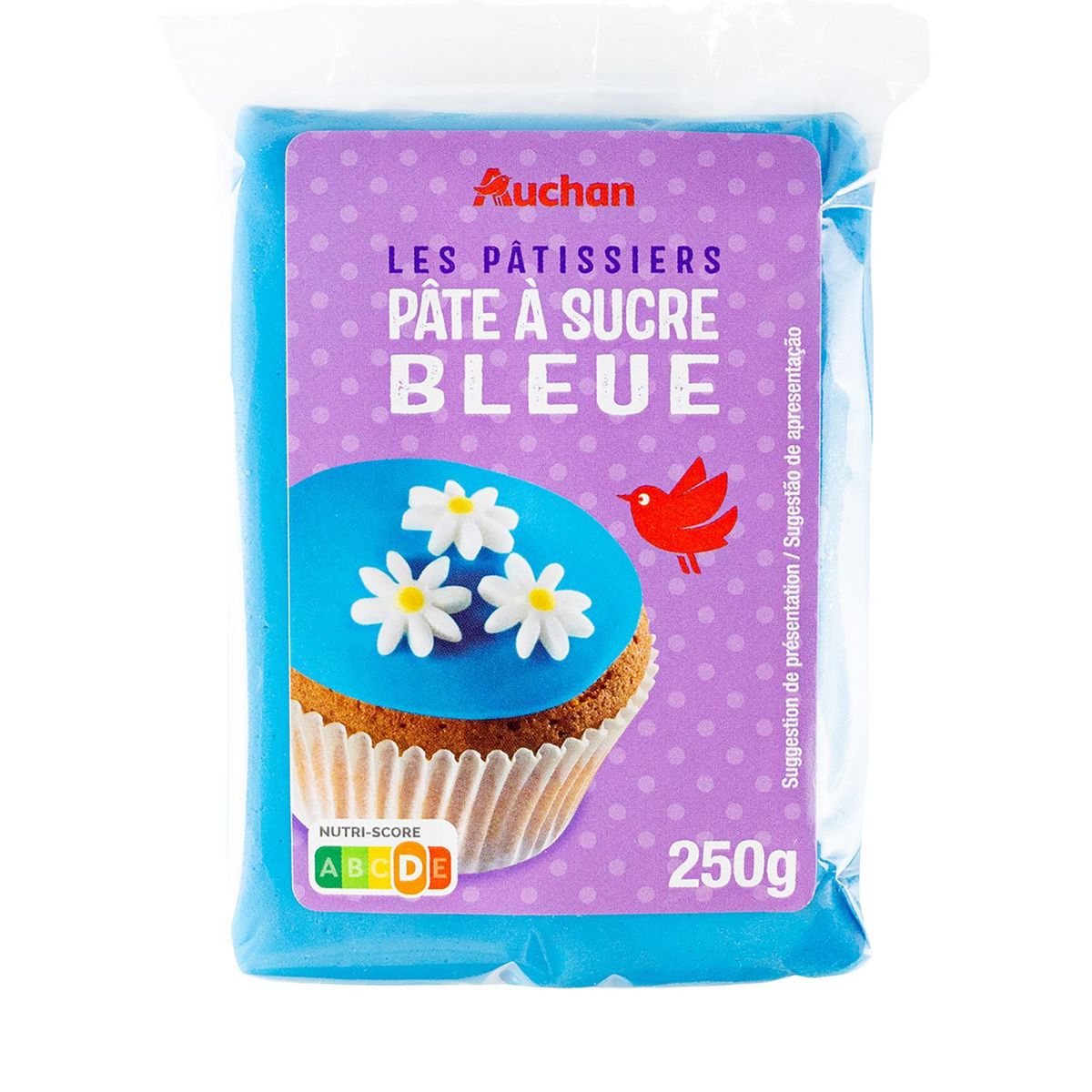Ingrédients : sucre,sirop de glucose, beurre de cacao, humectant : glycérol épaississants: gomme adragante, gomme cellulosique conservateur : sorbate de potassium, arôme naturel, acidifiant : acide citrique, colorant : bleubrillant FCF. Traces éventuelles d'amandes.