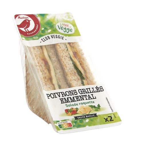 Sandwich au pain de mie complet garni d'emmental, de sauce à base de yaourt, de poivrons grillés, de roquette et de sauce basilic.