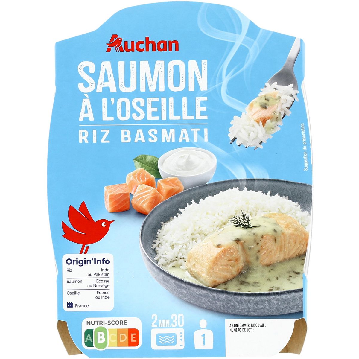 Ingrédients : Riz cuit 39% (eau, riz basmati), filet de saumon Atlantique 25,9% (POISSON), eau, crème fraîche 10,3% (LAIT - origine France), farine de BLÉ, oseille 2%, échalotes 1,4%, vin blanc, sel, vinaigre de vin blanc, jus concentré de citron, beurre (LAIT - origine UE et/ou Royaume-Uni), poivre, épice curcuma.