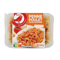 Ingrédients : pâtes alimentaires cuites 38% (semoule de BLÉ dur, eau, blanc d’OEUF, sel), eau, poulet grillé (filet de poulet, lactose (LAIT), antioxydant : citrates de sodium protéines de LAIT et de SOJA, sel, stabilisant : triphosphates gélifiant : carraghénanes) 12%, mascarpone (LAIT) 8%, tomates au jus (tomates, jus de tomates) 7,8%, edam (LAIT) 4,4%, double concentré de tomates, huile de colza, oignons 1,9%, arômes (contient CÉLERI), amidon modifié de maïs, sucre, sel, dextrose, fécule de pommes de terre, plantes aromatiques, épices, ail, sirop de candi. Pourcentages exprimés sur le total de la recette. Elaboré à partir de poulet et de lait origine UE.