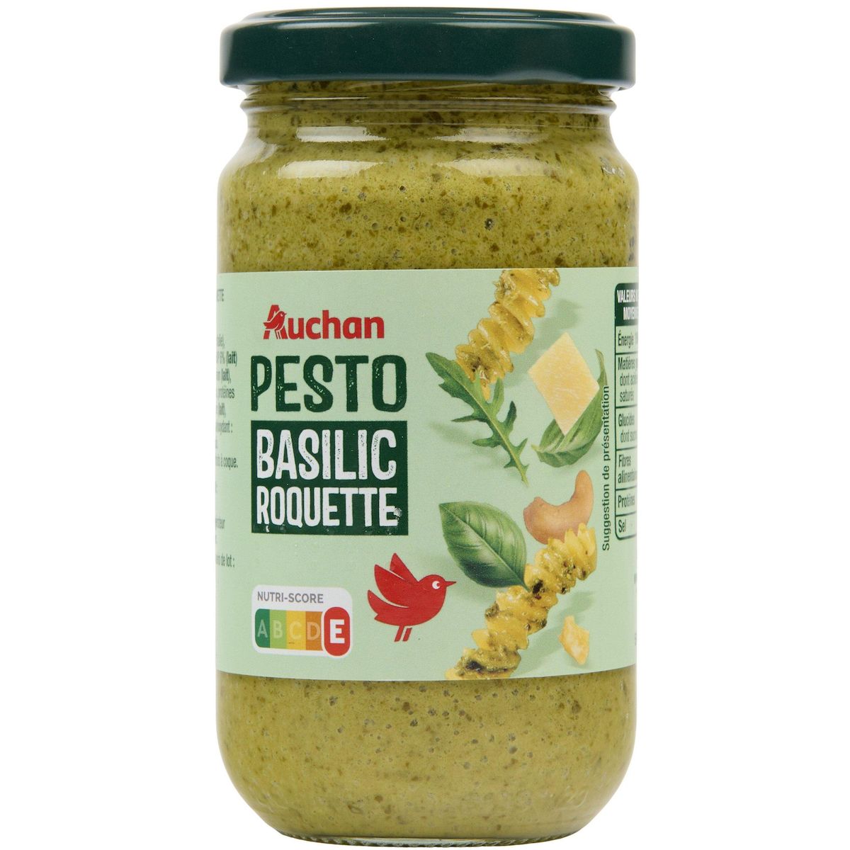 Ingrédients : Huile de tournesol, basilic 24% (origine Italie), roquette 10% (origine Italie), Grana Padano AOP 6% (LAIT)(contient ŒUFS) (lait origine Italie), lactosérum (LAIT), NOIX DE CAJOU 5%,huile d’olive vierge extra, protéines de lactosérum (LAIT), sucre, sel, babeurre(LAIT), correcteur d’acidité : acide lactique, ail,antioxydant : acide ascorbique, amidon de maïs. Traces éventuelles d’arachides et d’autres fruits à coque.
