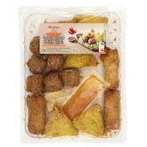 Ingrédients : Mini nems au porc (31.6%) : galette de riz 13.2% [eau, farine de riz, huile de tournesol, caramel (sucre, eau), sel], vermicelle de pois réhydraté, oignon, carotte, viande de porc 2,8% (origine : France), protéine de soja texturée, eau, gras de porc 0,5%, mix aromatique [sel, vinaigre de malt en poudre, maltodextrine de blé, épices (ail déshydraté, gingembre, cannelle, poivre noir, piment, curcuma), plantes aromatiques (coriandre, oignon en poudre), arômes], champignon noir réhydraté, amidon de maïs, sel.Boulettes porc Thaï (31.6%) : viande de porc 7.6%, eau, oignon, protéine de soja texturée, huile de tournesol, chapelure (farine de blé, sel), gras de porc 1.3%, fécule de manioc, basilic Thaï 0,7%, oeuf entier en poudre, ail, sel, huile de sésame, sucre, épices (cannelle, girofle, poivre, muscade), piment.Samossas au poulet (26.4%) : galette de blé 9.7% (eau, farine de blé, huile de tournesol, blanc d'oeuf en poudre, sel, curcuma, émulsifiant : lécithine de colza), oignon, eau, viande de poulet 3.3% (origine : France), carotte, protéine de soja texturée, chapelure (farine de blé, sel), huile de tournesol, curry (contient moutarde), ciboulette, ail, sel, amidon de maïs, curcuma.Sauce nuoc-mâm (5.2%) : eau, sucre, nuoc-mâm 0,7% (poisson, sel, eau), vinaigre, sel.Sauce aigre douce (5.2%) : eau, sucre, vinaigre d’alcool, ananas, poivron rouge, amidon modifié de maïs, huile de tournesol, sel, acidifiant : acide citrique ,épices et plantes aromatiques (curry, gingembre) épaississants : gomme guar, gomme xanthane.Pourcentages exprimés sur le total de la recette.Traces éventuelles de crustacés, lait et fruits à coque.
