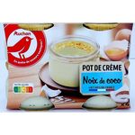 Ingrédients : LAIT entier 61.7%, ŒUFS entiers 12%, sucre 12%, crème (LAIT) 8.3%, noix de coco râpée 2.5%, amidon de maïs, poudre de LAIT écrémé, arôme. Traces éventuelles de blé. Elaboré à partir de lait origine France.