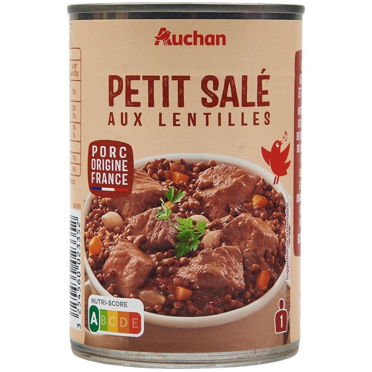 Ingrédients : Eau,lentilles trempées précuites 30%, viande de porc traitée en salaison précuite24 % (viande de porc (origine: France), eau, sel, stabilisant : triphosphates), carottes 5 %,oignons grelots 1%, double concentré de tomates, saindoux, oignon en poudre, sel, arômes naturels, amidon de maïs, ail en poudre, affermissant: chlorure de calcium. Pourcentages exprimés par rapport au poids net total.