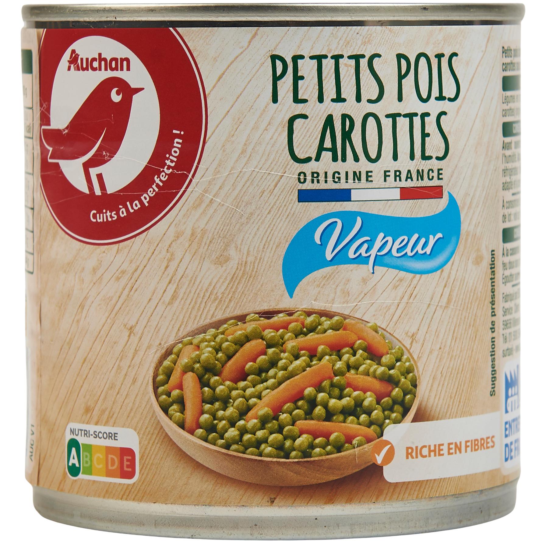Ingrédients : Légumes en proportion variable (petits pois, carottes) (Origine France), eau, sucre, sel.