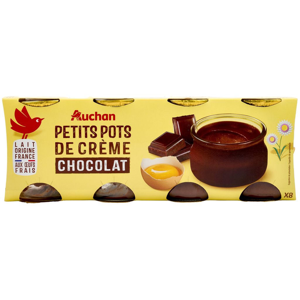 Ingrédients : LAIT entier 59%, crème (LAIT) 14,6%, sucre 9,6%, chocolat 5,6% (sucre, pâte de cacao*, cacao maigre en poudre*, émulsifiant : lécithines), ŒUFS entiers 5%, chocolat en poudre 3,6% (sucre, cacao en poudre*), amidon modifié de manioc, poudre de cacao maigre* 0.8%, épaississants : cellulose, gomme de cellulose gélifiant : carraghénanes. Traces éventuelles de blé. Elaboré à partir de lait origine France. *Certifié Rainforest Alliance. ra.org.En achetant du cacao certifié Rainforest Alliance, AUCHAN soutient la culture responsable de cacao. www.rainforest-alliance.org