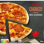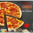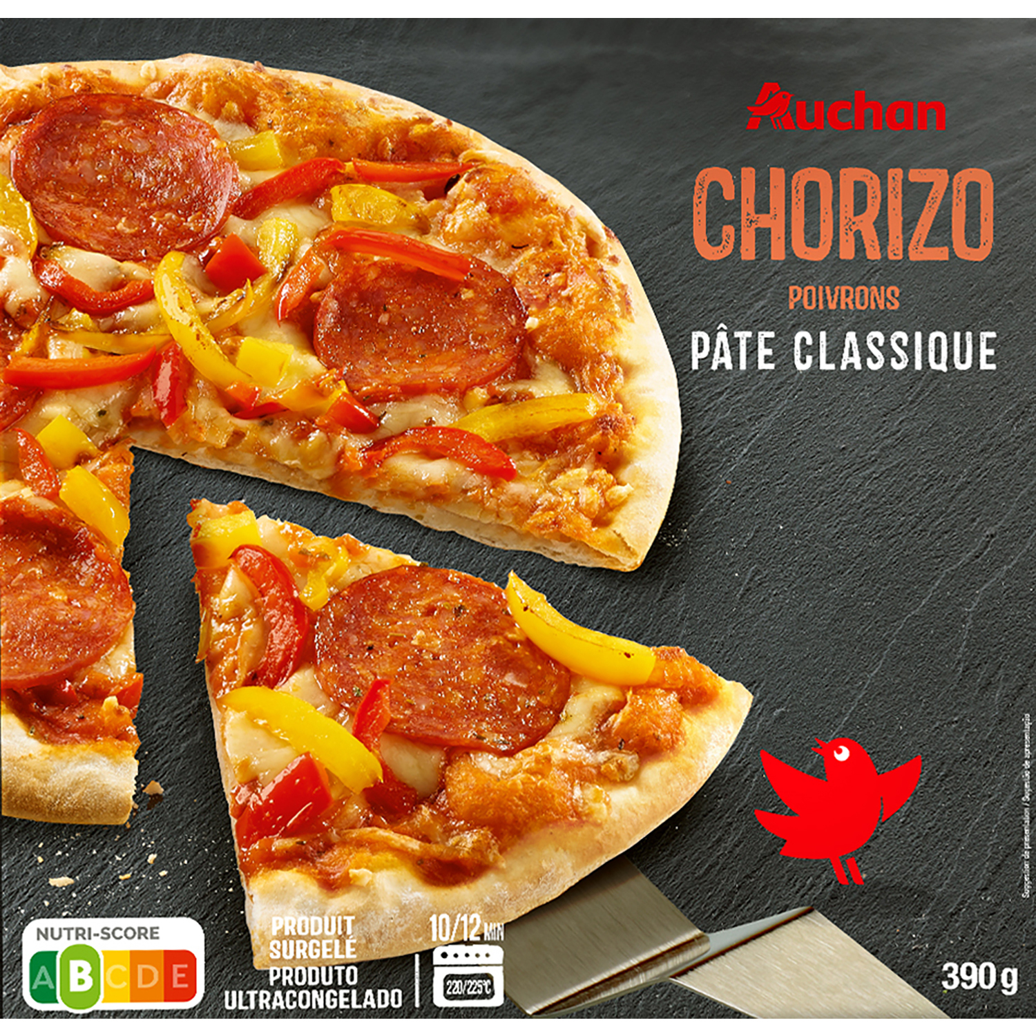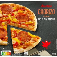 Pizza garnie de chorizo, mozzarella, emmental, poivrons rouges et poivrons jaunes, surgelée.