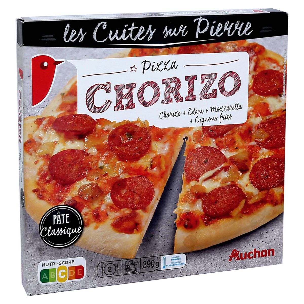 Farine de blé, purée de tomates, eau, chorizo fumé 9% (viande de porc, gras de porc, sel, épices, dextrose, antioxydant : extraits de romarin, conservateur: nitrite de sodium, fumée naturelle au bois de hêtre), mozzarella 6,9% (lait), emmental 4,6% (lait), poivrons rouges 4,5%, poivrons jaunes 4,5%, huile végétale de colza, sucre, sel, levure, amidon, amidon de blé, plantes aromatiques, dextrose, épices.Pourcentages exprimés sur le total de la recette.Traces éventuelles de céleri.Elaboré à partir de viande de porc d'origine UE et de lait d'origine UE.