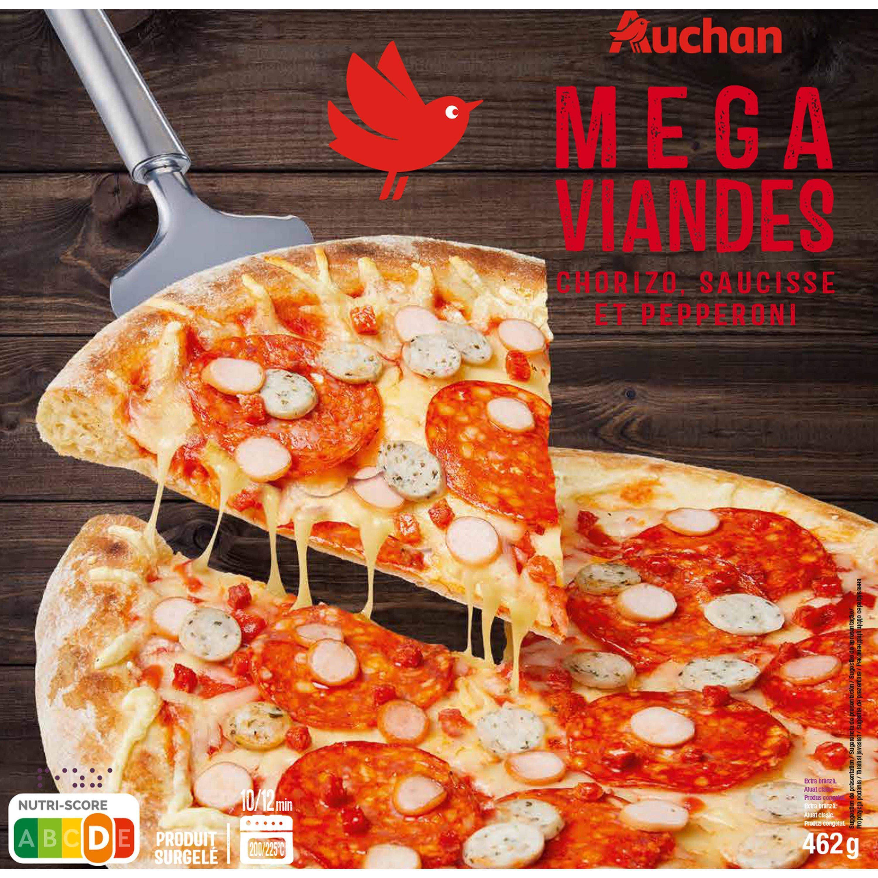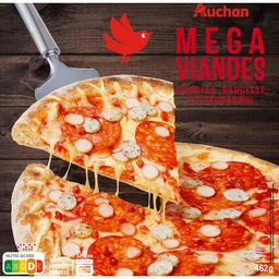 Pizza à base de chorizo, emmental, mozzarella, saucisse de porc cuite, saucisse de porc cuite fumée et pepperoni - Surgelée.