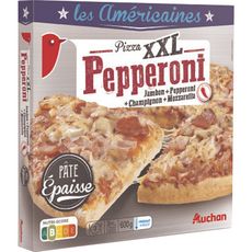 Ingrédients : farine de blé , eau, jambon cuit standard 7,5% (jambon de porc (origine UE), eau, dextrose, sel, arômes naturels, antioxydant : érythorbate de sodium, conservateur : nitrite de sodium), pepperoni cru fumé 6% (viande de porc (origine France), lard, sel, épices, dextrose, sirop de glucose, extrait de Kombucha, extraits d'épices antioxydants : extrait de romarin, acide érythorbique, érythorbate de sodium fumage naturel au bois de hêtre), champignons 5%, mozzarella 5% (lait ), concentré de tomates, oignons, cheddar 3% (lait ), huile de colza, levure boulangère, sucre poudres à lever : diphosphate disodique, carbonate acide de sodium amidon de blé , sel, amidon de maïs, purée de piments (piments, sel, correcteur d'acidité : acide acétique), origan, ail, poivre, paprika, basilic, cumin. Pourcentages exprimés sur le total de la recette. Traces éventuelles de poisson, crustacé, mollusque. œuf, moutarde et céleri. Elaboré à partir de lait origine UE.