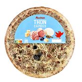 PIZZA THON CÂPRES GARNIE DE SAUCE TOMATE, DE THON LISTAO AU NATUREL, DE MOZZARELLA, D'EMMENTAL ET DE CIBOULETTE.