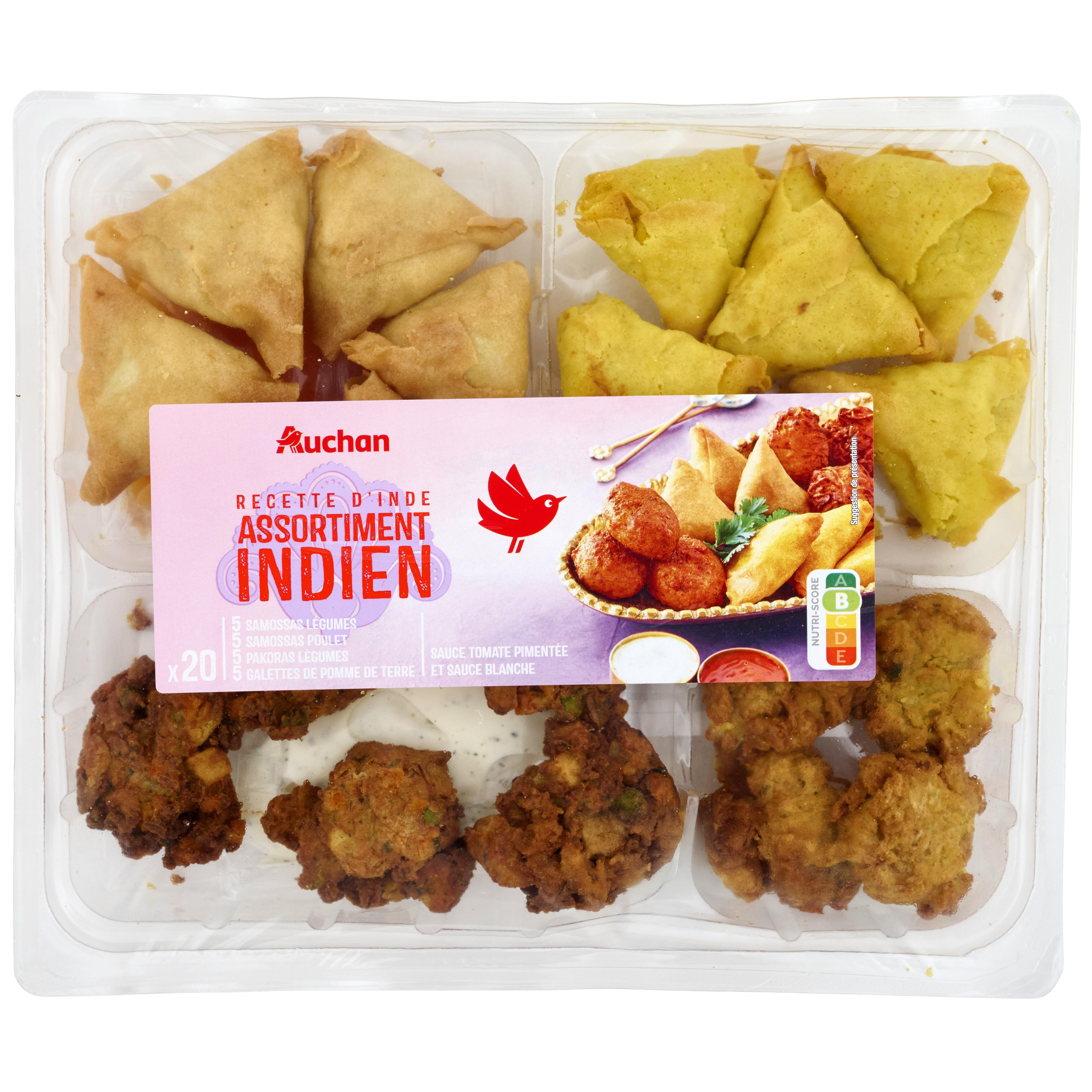 Ingrédients : Samossa aux légumes (18,9%) : galette de BLÉ 34,8% (eau, farine de BLÉ, huile de tournesol, blanc d'OEUF en poudre, sel, émulsifiant : lécithine de colza), oignon, chou-fleur 2%, carotte 1,9%, courgette 1,7%, brocoli 1%, protéine de SOJA texturée, petit pois 0,6%, flocon de pomme de terre déshydraté, huile de tournesol, ail, amidon de maïs, curry (contient MOUTARDE), OEUF entier en poudre, sel, sucre, cumin. Samossa au poulet (23,6%) : galette de BLÉ 35,7% (eau, farine de BLÉ, huile de tournesol, blanc d'ŒUF en poudre, sel, curcuma, émulsifiant : lécithine de colza), viande de poulet 5,4% (origine France), oignon, crème (LAIT), carotte, protéine et amidon de BLÉ, chapelure (farine de BLÉ, sel), curry (contient MOUTARDE), ciboulette, ail, sel, curcuma. Pakora de légumes (23,6%) : chou-fleur 3%, pomme de terre, carotte 2,8%, oignon, brocoli 1,9%, petit pois 1,9%, protéine de SOJA texturée, huile de tournesol, farine de BLÉ, eau, OEUF entier en poudre, ail, coriandre, blanc d'OEUF en poudre, sel, amidon de maïs, poudres à lever : disodium dihydrogen pyrophosphate et bicarbonate de sodium amidon de BLÉ, cumin, piment fort. Galette de pomme de terre (18,9%) : pomme de terre râpée 8,8%, oignon, huile de tournesol, flocon de pomme de terre déshydraté, protéine de SOJA texturée, OEUF entier en poudre, ail, amidon de maïs, citronnelle, sel, blanc d'OEUF en poudre, coriandre, gingembre, curcuma, piment fort. Sauce blanche (7,5%) : eau, huile de colza, LAIT-écrémé en poudre, jaune d'OEUF, sel, menthe, ail, jus de citron concentré, amidon modifié de pomme de terre, acidifiant : acide tartrique, épaississants : gomme guar et gomme xanthane, arôme naturel de menthe, conservateur : sorbate de potassium, poivre. Sauce à la tomate pimentée (7,5%) : eau, sucre, oignon, concentré de tomate, amidon modifié de pomme de terre, vinaigre d'alcool, sel, purée de piments (piments, vinaigre, sel), acidifiant : acide citrique, conservateur : sorbate de potassium arôme naturel. Traces éventuelles de crustacés, poisson et fruits à coque. Pourcentages exprimés sur le total de la recette.