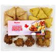 Assortiment de spécialités indiennes frites : 5 samossas aux légumes (galettes de blé farcies aux légumes) - 5 samossas au poulet (galettes de blé farcies au poulet et légumes) - 5 pakoras (beignets aux légumes et à la pomme de terre) - 5 galettes de pomme de terre - sauce blanche - sauce à la tomate pimentée