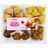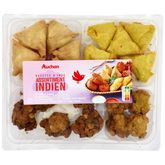 assortiment composé de 5 samossas à la volaille, 5 pakoras, 5 samossas au bœuf, 5 galettes de pomme de terre épicées avec sauces chutney mangue et sauce blanche