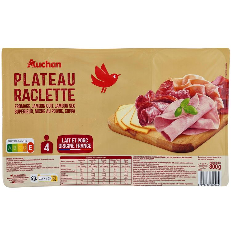 Notre plateau raclette Auchan pour 4 personnes est composé de tranches de jambon cuit, tranches de miche au poivre, tranches de filet de bacon et 4 tranches de jambon sec, le tout accompagné de tranches de fromage. C'est le plateau idéal et économique pour vos soirées raclette en famille ou entre amis !