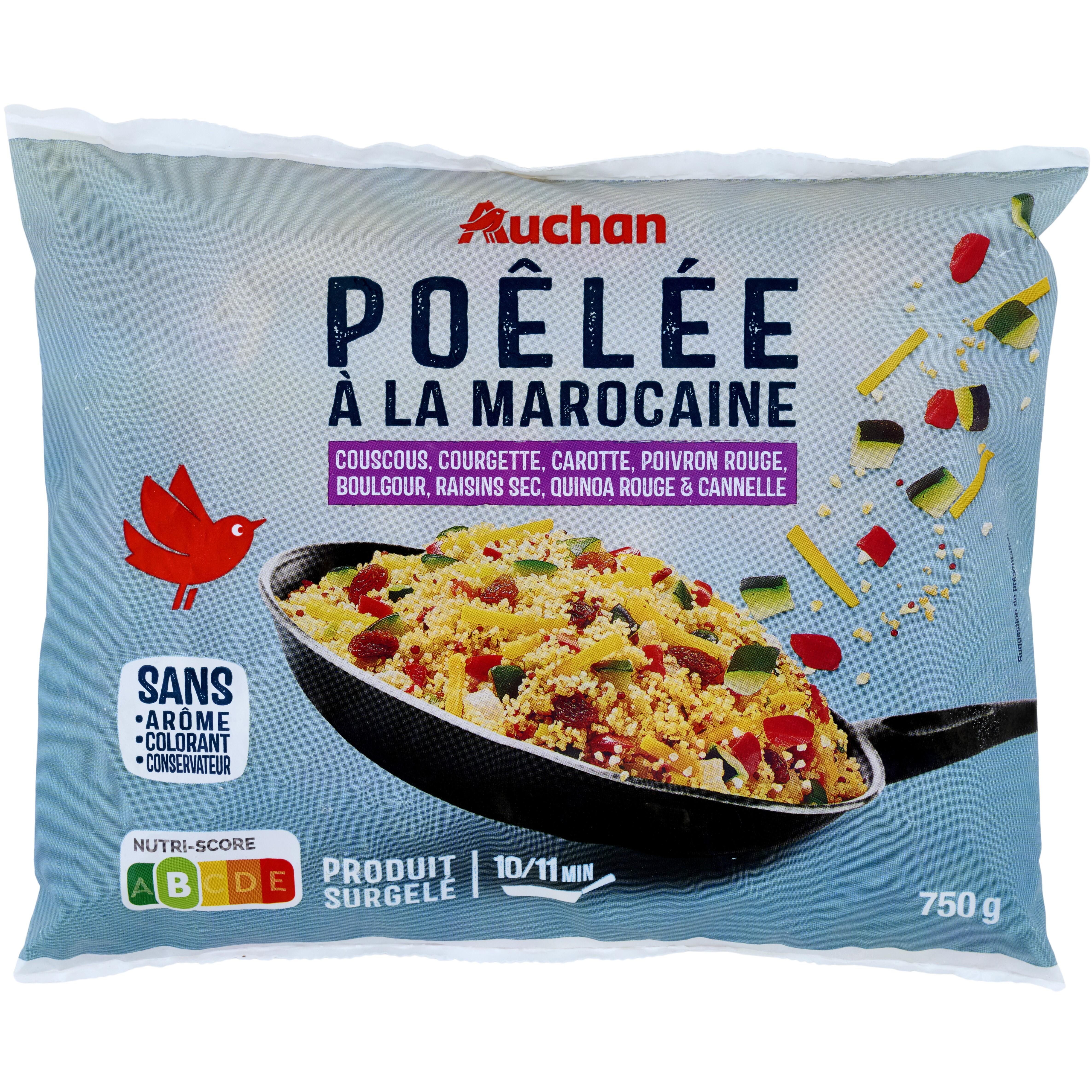 Ingrédients : couscous hydraté 28% (semoule de BLÉ dur, eau, huile d'olive vierge extra, sel, coriandre), courgette 18%, carotte jaune18%, poivron rouge 10%, eau, oignon, boulgour (BLÉ) 5%, raisin sec réhydraté 3% (raisin, huile de tournesol, eau), quinoa rouge cuit 2,3% (quinoa rouge, eau, sel), huile d'olive vierge extra, tomate déshydraté, persil, basilic, sel, jus de légumes concentré (carotte, oignon, poireau), ail, jus de citron jaune, thym, cannelle 0,01%, extrait de poivre épaississants : gomme de guar, gomme de xanthane dextrose Traces éventuelles de moutarde et céleri.