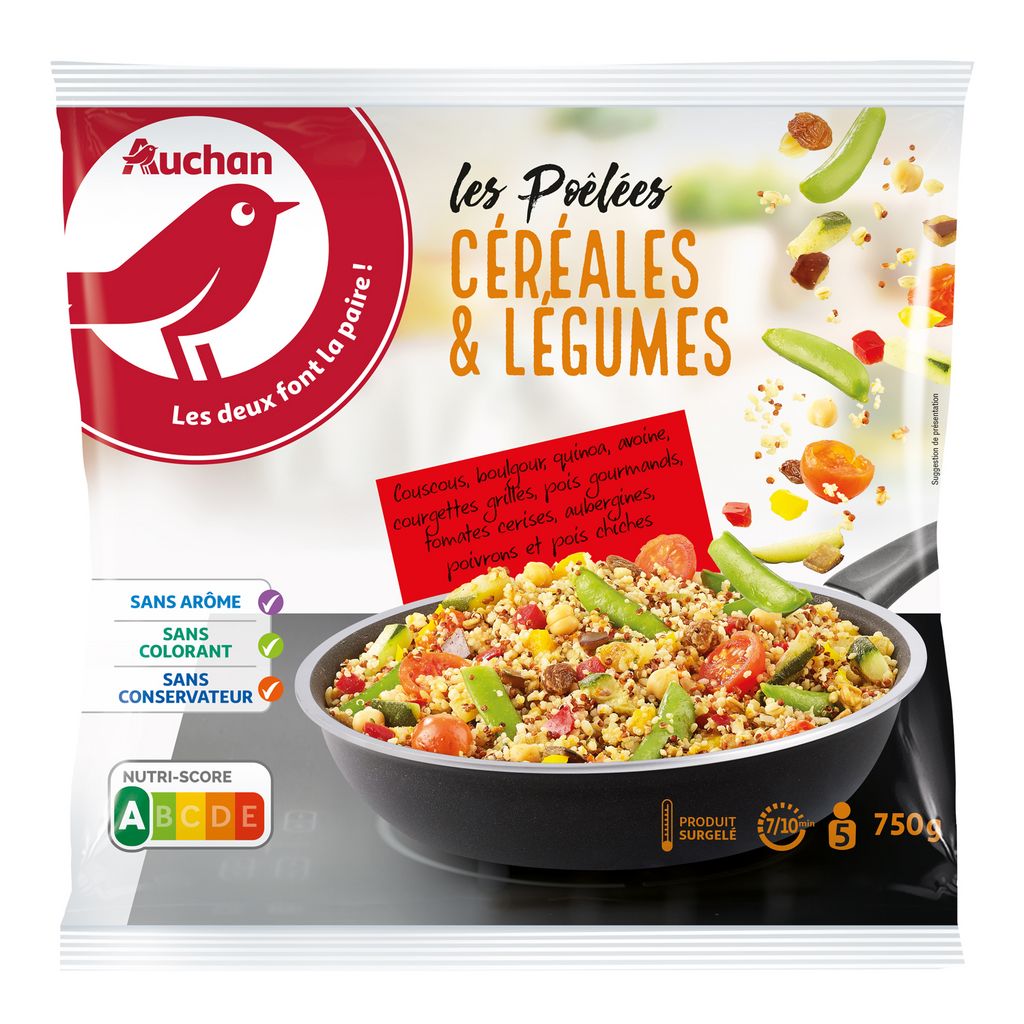 couscous cuit 8% (eau, semoule de blé dur), boulgour cuit 8% (eau, boulgour (blé)), quinoa cuit 8% (eau, quinoa), orge 8% complet cuit, quinoa rouge cuit 8% (eau, quinoa), avoine cuite 8% (eau, avoine), courgettes grillées, pois gourmands, tomates cerises, aubergines grillées, pulpe de tomates, poivrons rouges, poivrons jaunes, tomates semi-séchées au four, pois chiches (pois chiches, eau, sel, antioxydant: acide ascorbique), abricots séchés (abricots séchés, farine de riz, conservateur: anhydride sulfureux) , eau, raisins secs (raisin, huile de coton), céleri, huile d'olive, purée de tomates, oignons grillés, vinaigre, sel, amidon de tapioca, basilic, ail, thym