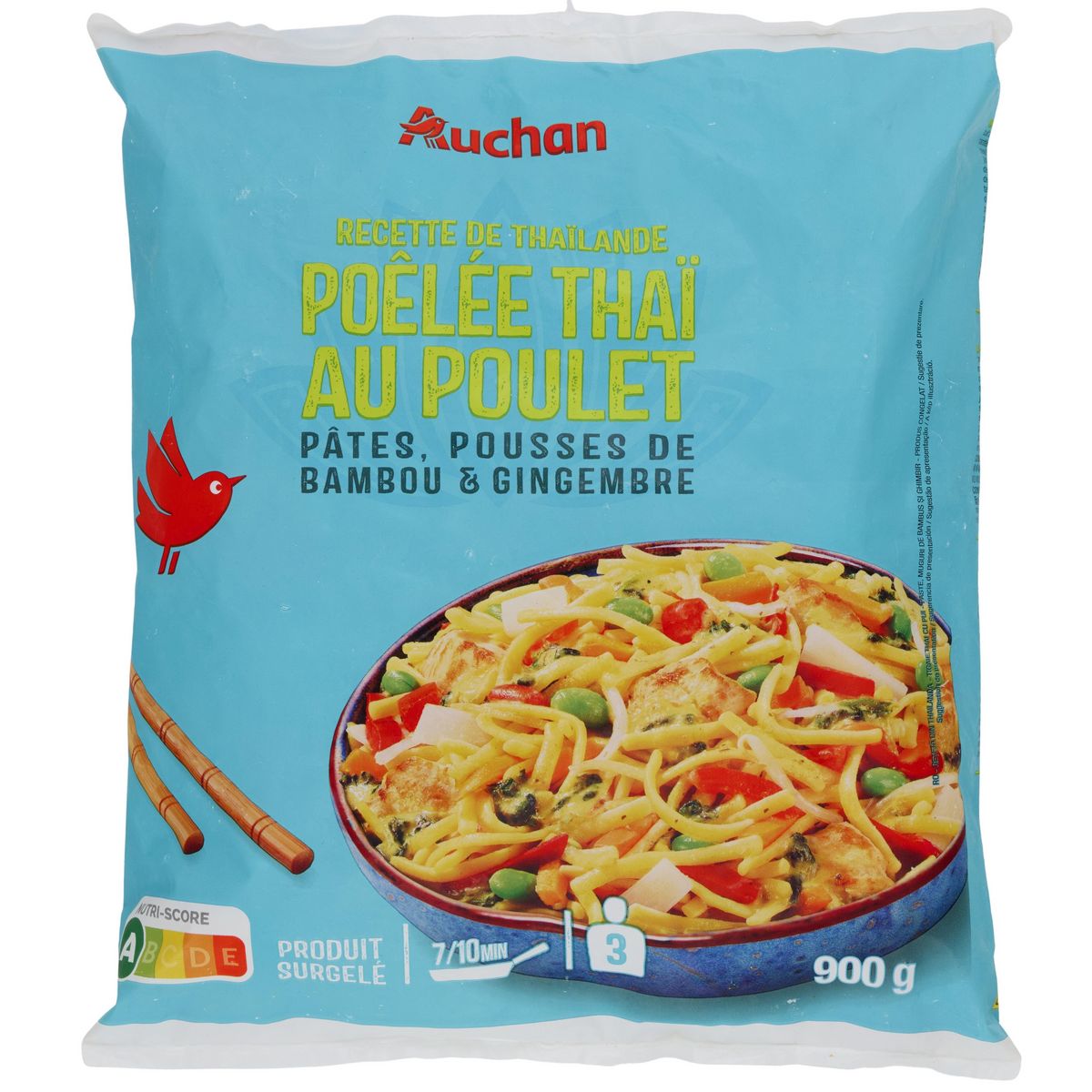 Ingrédients : pâtes cuites 25% (eau,farine de BLÉ dur), poulet cuit traité en salaison 15% (blanc de poulet, sel,amidon, dextrose), haricots mungo 7%, carottes 7%, eau, épinards 6%, tomates 6%,crème de coco (extrait de coco, eau), poivron rouge 5%, graines de SOJA 5%,pousses de bambou 4%, échalote, lait de coco en poudre (lait de coco,maltodextrine, caséinate de sodium (LAIT)), purée de gingembre 0.9%,sauce de poisson (eau, sel, extrait de POISSON, sucre, vinaigre), ail,sauce de soja (eau, graines de SOJA, BLÉ, sel), jus de citronvert, huile de SÉSAME, basilic thaïlandais, fécule de tapioca, sucre decanne, coriandre, sel, oignon préfrit (oignon, huile de tournesol), feuille de citron vert kaffir, huile de colza, citronnelle, piment en poudre, piment,cumin en poudre, curcuma en poudre, graines de fenouil en poudre, cardamome en poudre, poivre noir