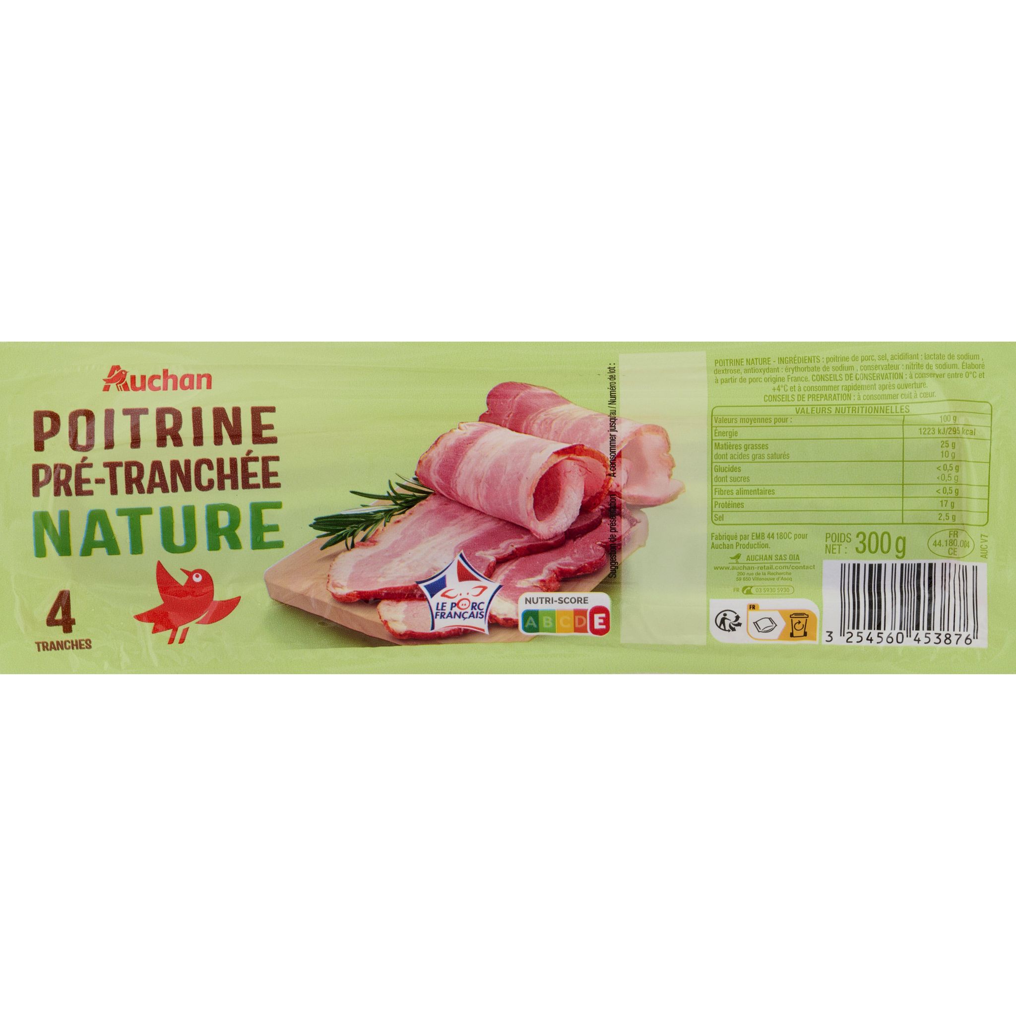 La poitrine de porc Auchan nature , prétranchée pour plus de praticité, est un régal pour les petits déjeuners salés, un délice enroulée à des légumes pour un coeur de repas gourmand, si facile à griller à la plancha ou pour sublimer vos soirées raclette. Une charcuterie fine et savoureuse pour des applications culinaires astucieuses du quotidien.