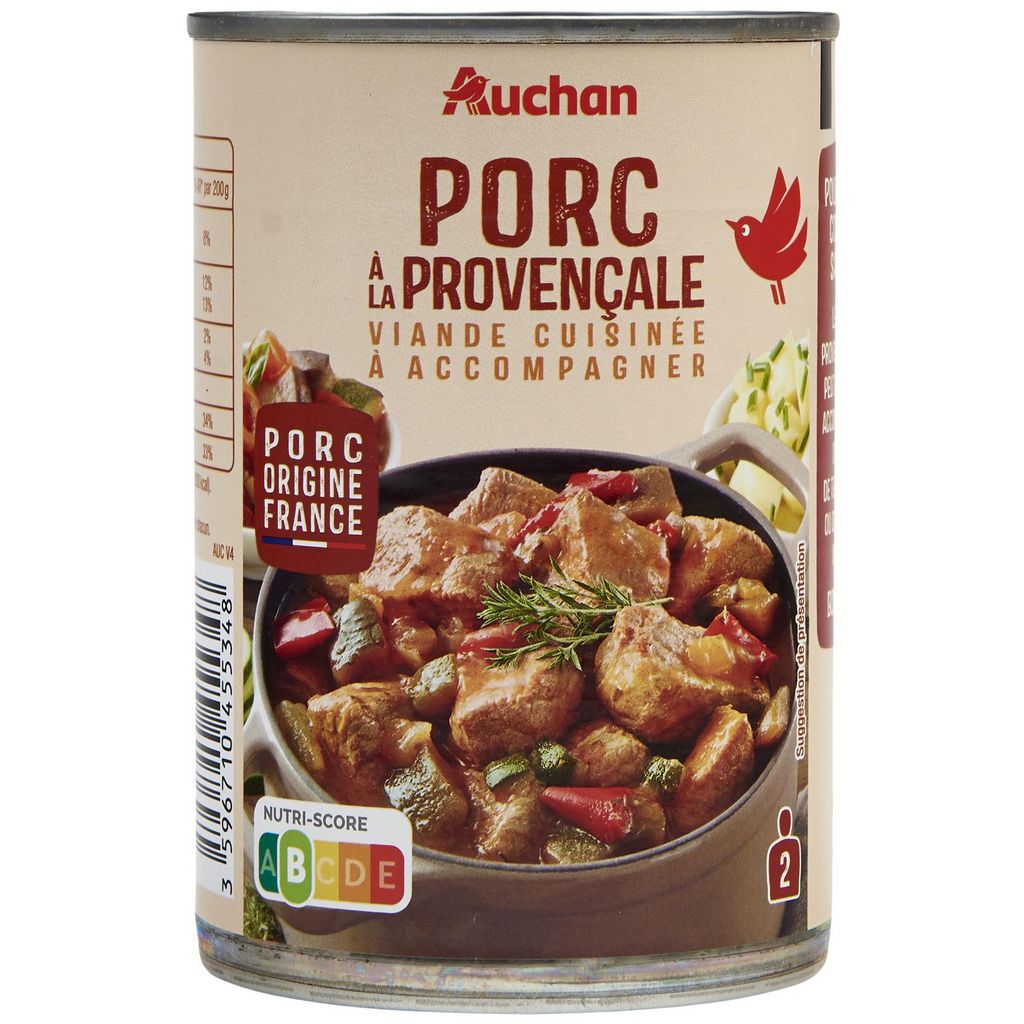 Ingrédients : Viande de porc traitée en salaison et précuite 45% (viandede porc 35%, eau, sel, stabilisant : triphosphates, gélifiant : algues Eucheuma transformées), eau, courgettes 7,5%, aubergines 7,5%, tomates 6%, oignons 6%,poivrons rouges 4,9%, double concentré de tomates, épices et plantes aromatiques, huile d'olive vierge 0,9%, sucre, amidon modifié de maïs, arômenaturel, sel. Elaboré à partir de viande de porc origine France. Pourcentages exprimés par rapport au poids net total.
