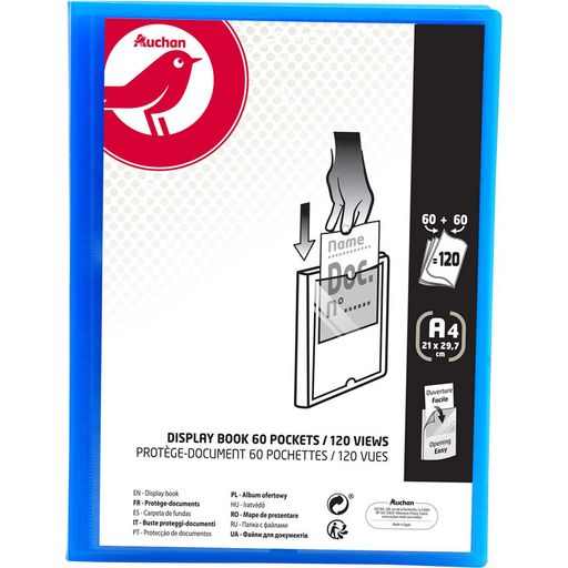 Ce protège-documents protège efficacement vos documents tout en assurant une présentation soignée ! Sa couverture en PVC souple avec pochette de présentation préserve le contenu de la poussière et de l’humidité, et ses 60 pochettes en polypropylène lisse permettent une bonne lisibilité. Dimensions 23,5 x 31,5 cm. Existe en différents coloris.