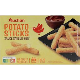 Bâtonnets enrobés d'une panure (28,8%) et garnis d'une farce (51,2%) à base de pommes de terre, pré-frits, à cuire, accompagnés d'un sachet de sauce (20%) saveur barbecue, surgelés.