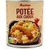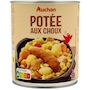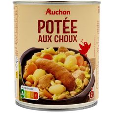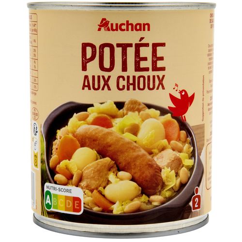 Ingrédients : Choux précuits 28%, eau, viande de porc traitée en salaison et précuite 13% (viande de porc, eau, sel, stabilisant : triphosphates, gélifiant : algues Euchéma transformées), saucisses fumées pur porc 13% (viande de porc, eau, plasma de porc, sel), pommes de terre 7%, haricots blancs trempés précuits 5%, carottes 5%, poireaux 2,5%, sel, affermissant : chlorure de calcium. Elaboré à partir de viande de porc origine UE.Traces éventuelles de lait et de céréales contenant du gluten.Pourcentages exprimés par rapport au poids net total.