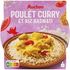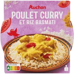 Ingrédients : Riz basmati (eau, riz, huile de colza, sel) 40%,poulet (origine UE) 25%, eau, tomate 6%, crème fraîche (lait origine France), lait de coco (extrait de coco, eau), huile de colza, curry 0.9%, amidon modifié de maïs, bouillon de volaille (sel, arômes naturels, graisse de poule, extrait de levure, épices, plantes aromatiques), sel, oignon, sucre, épaississants : gomme xanthane, gomme guar.Pourcentages exprimés sur le total de la recette.Traces éventuelles de céréales contenant du gluten, de poisson, d'œufs et de moutarde.
