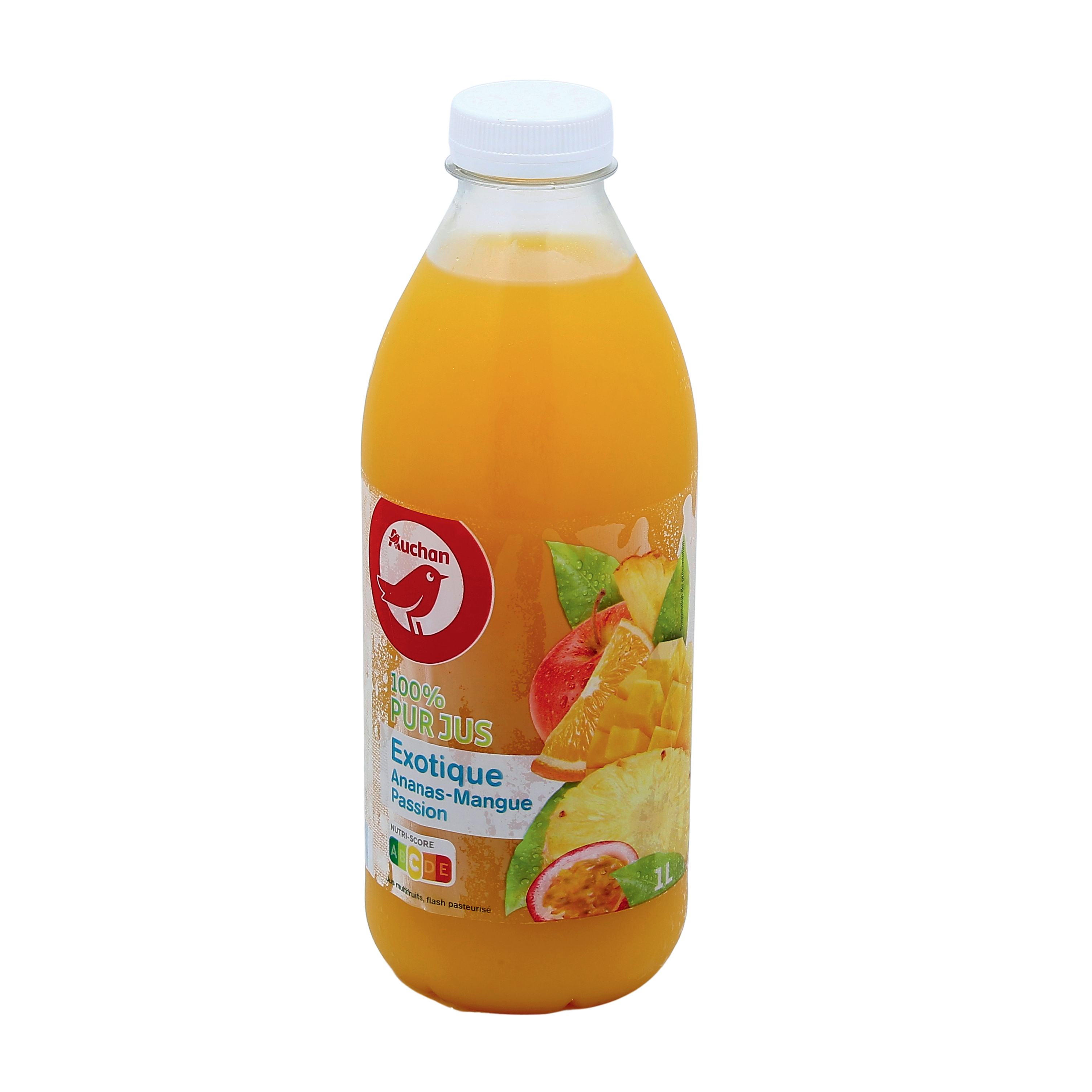 Ingrédients : Jus de pomme 50%, jus d'orange 35%, jus d'ananas 11%, purée de mangue 2%, jus de fruit de la passion 2%.