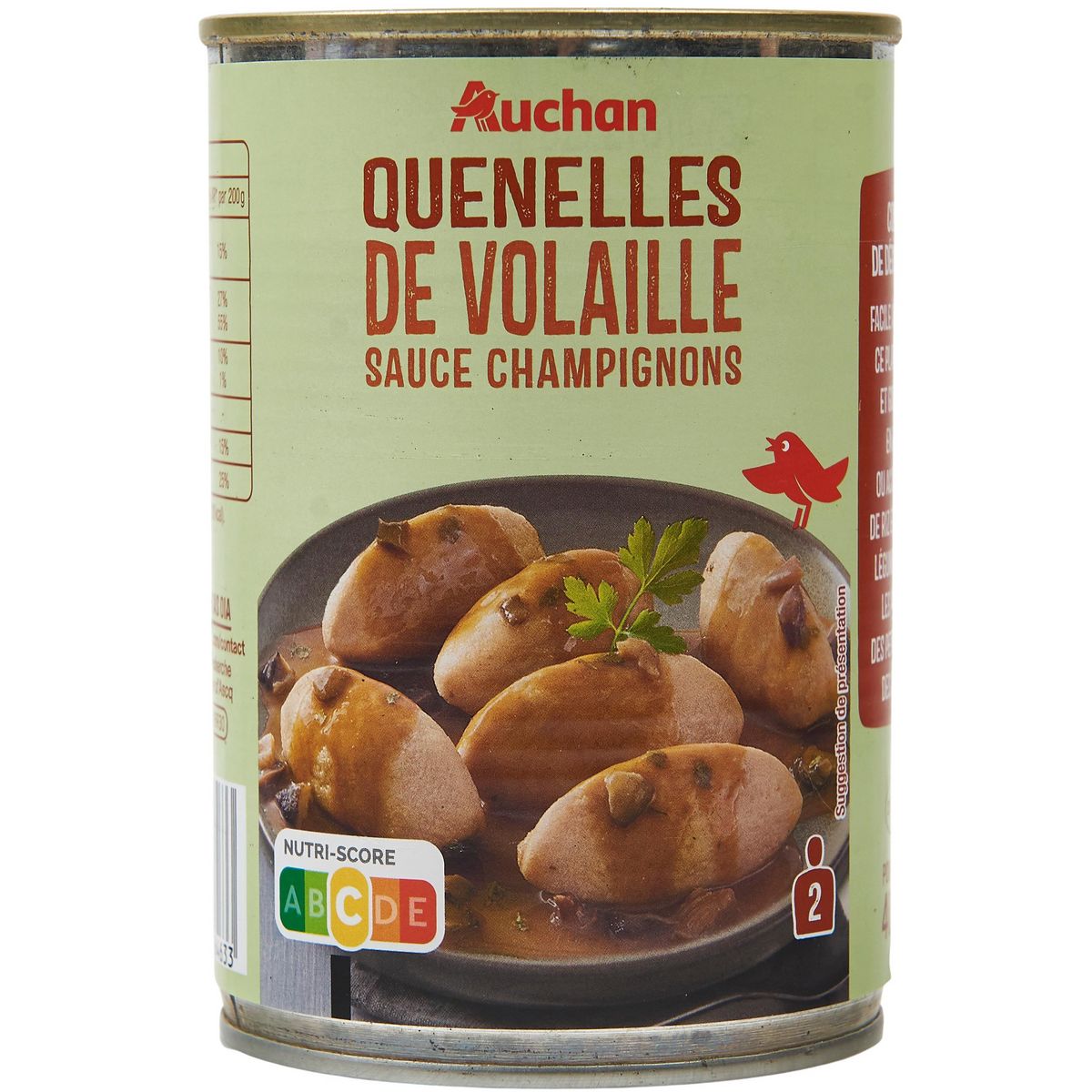 Ingrédients : Eau, quenelles de volaille 36% (farine de BLÉ, graisse de bœuf, eau, viande de dinde* : 4.8%, blancs d’ŒUFS, sel, gluten de BLÉ, protéines de LAIT), mélange de champignons forestiers surgelés 4% (bolets jaunes, shiitakés, pleurotes, girolles en proportions variables), champignons de Paris saumurés (champignons 2%, eau, sel, acidifiant : acide citrique, antioxydant :acide ascorbique), crème fraîche (LAIT), amidon de riz, farine de BLÉ, double concentré de tomates, arômes naturels, bouillon de volaille (sel, maltodextrine, sucre, arômes, graisse de poulet, extrait de levure, oignon, viande de poulet, épices, plantes aromatiques), persil, poudre de bolets jaunes 0.06%, plantes aromatiques. *Origine : UE