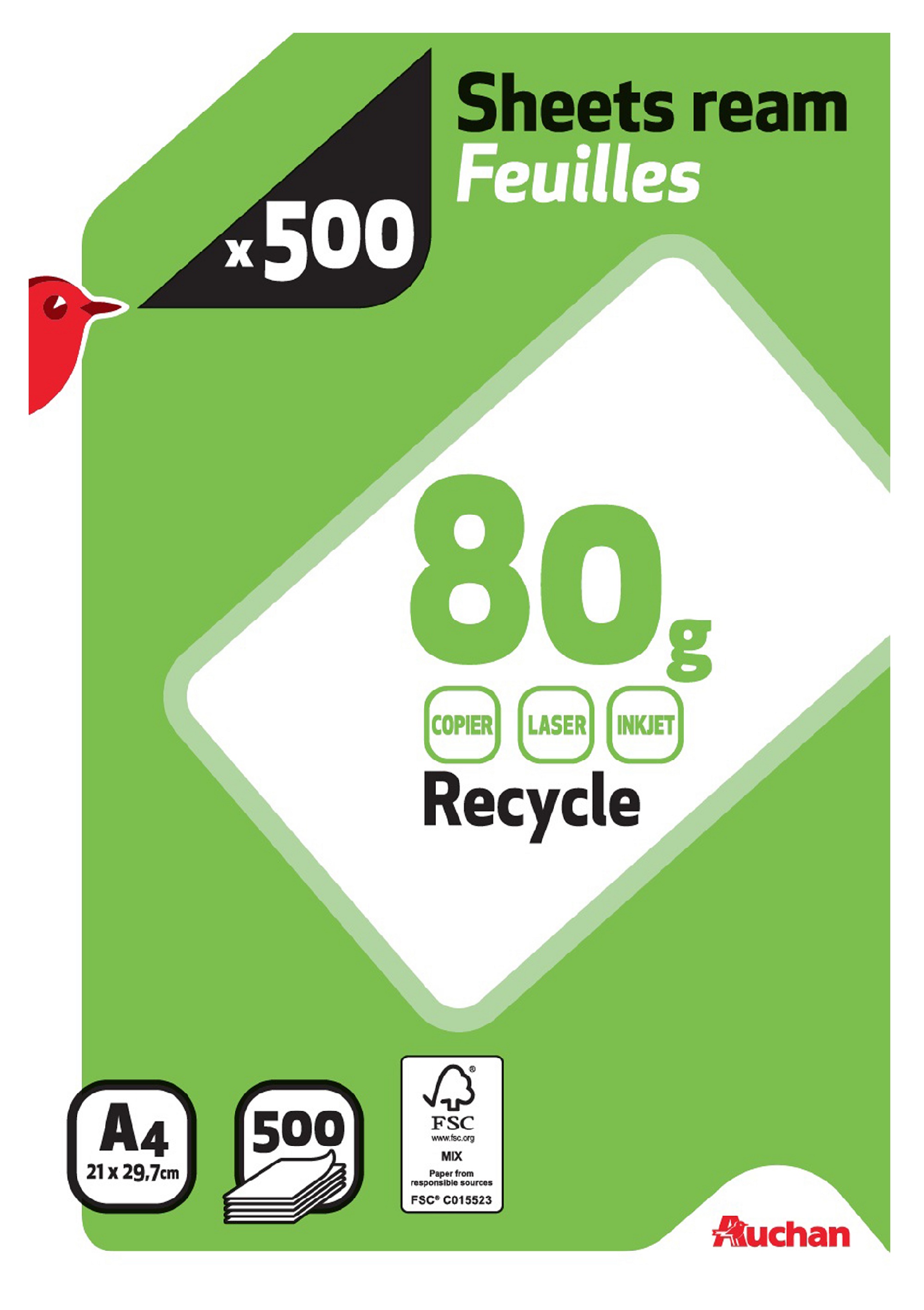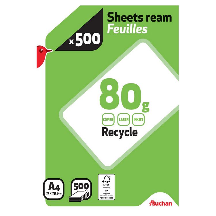 Vous pouvez utiliser le papier Auchan pour tous types de travaux dont les photocopies, télécopies, impression et notamment les impressions laser et jet d'encre au recto comme au verso. Conseils d'utilisation : entreposer le papier dans un endroit sec, à température constante. FSC. Ramette de 500 feuilles.