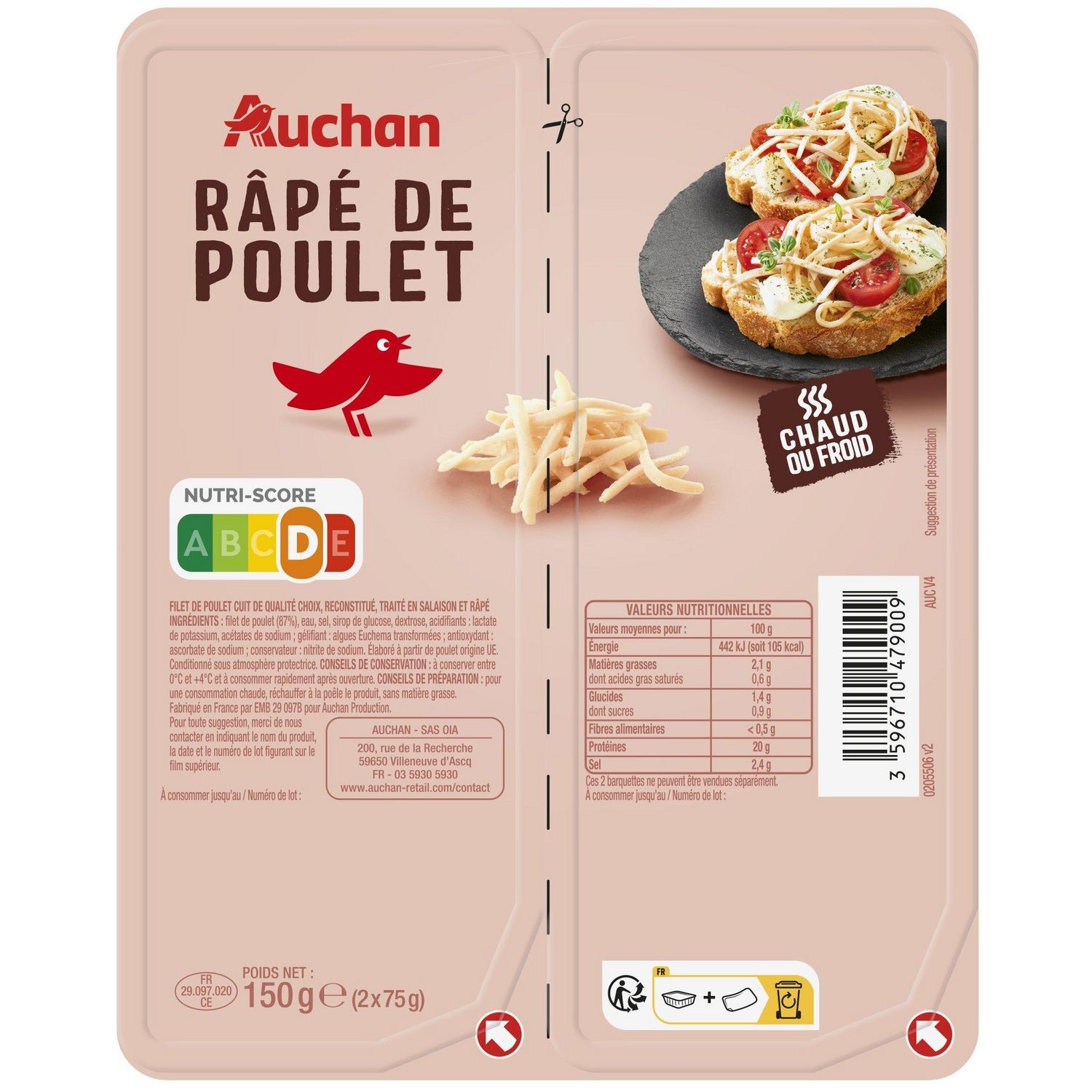 Les râpés de poulet d'Auchan, pourront être dégustés sur des toasts, en salade, ils s'adapteront aussi bien à vos plats chauds, qu'aux froids, selon vos envies quotidiennes. Régalez-vous!