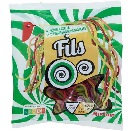 Ingrédients : Sirop de glucose, farine de BLÉ, sucre, sucres extraits de fruits (fructose, glucose, saccharose), dextrose, graisse de palme, acidifiants : acide citrique - acide lactique, concentrés de spiruline - de jus de carotte pourpre - de carthame - de carotte et d'hibiscus, arômes naturels, huiles végétales (coco, colza), agent d'enrobage : shellac.